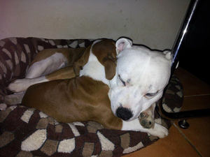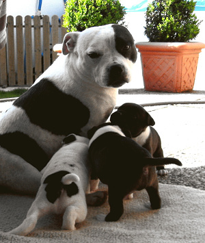 | dh. "Black and Tan" mit weißen Abzeichen oder sogar fast vollständig weiß mit nur wenigen Markierungen. Ich habe tatsächlich einen Stafford gesehen, der in jeder Hinsicht Pied aussah, aber der schwarze Fleck auf seinem Gesicht enthielt eine rote Augenbraue und ein bisschen Rot auf der Wange und unter der Rute. Dies war ein "Black and Tan" Stafford, dessen Farbe größtenteils durch das weiße Flecken-Gen mit Weiß bedeckt war. |