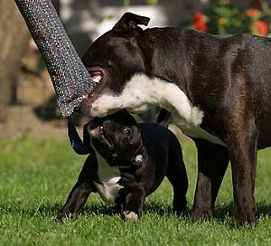 Der Staffordshire Bullterrier ist ein vielseitiger Begleiter, der noch dazu mit einer robusten Gesundheit und Vitalität bis ins hohe Alter aufwarten kann. Sein pflegeleichtes Kurzhaar sowie seine Größe machen ihn, genügend Auslauf und Familienanschluss vorausgesetzt, zum idealen Mitbewohner auch in kleineren Wohnungsgrößen. Die Ausgeglichenheit und Nervenstärke machen ihn zu einem sicheren Begleiter, selbst im dichten Großstadtverkehr. Die Erziehung ist recht einfach, wenn man bereit ist viel Liebe, etwas Geduld und vor allem Konsequenz zu investieren. Man sollte schon sehr früh mit spielerischer Erziehung des Junghundes beginnen, um auch eine optimale Wesensentwicklung zu fördern. Der Staffordshire Bullterrier hat ein stets neugieriges und fröhliches Wesen, welches die Erziehung wesentlich erleichtert. Um diesen Charakter ausleben zu können braucht er Beschäftigung, so empfiehlt es sich ab einem Jahr regelmäßig etwas mit ihm zu unternehmen, wie Wandern, Laufen, Schwimmen und verschiedene Hundesportarten, z.B. Begleithundesport, Fährtenarbeit, Agility, Breitensport. Aber auch als Rettungs- oder Therapiehund wird er verwendet. Sinnvoll wäre ein Begleithundekurs, wo man nicht nur den Gehorsam lernt, sondern es ist auch der Kontakt mit anderen Hunden sehr wichtig für richtiges Sozialverhalten. Nicht übertriebener Ehrgeiz, sondern der Spaß an der Sache sollte das Wichtigste sein. |